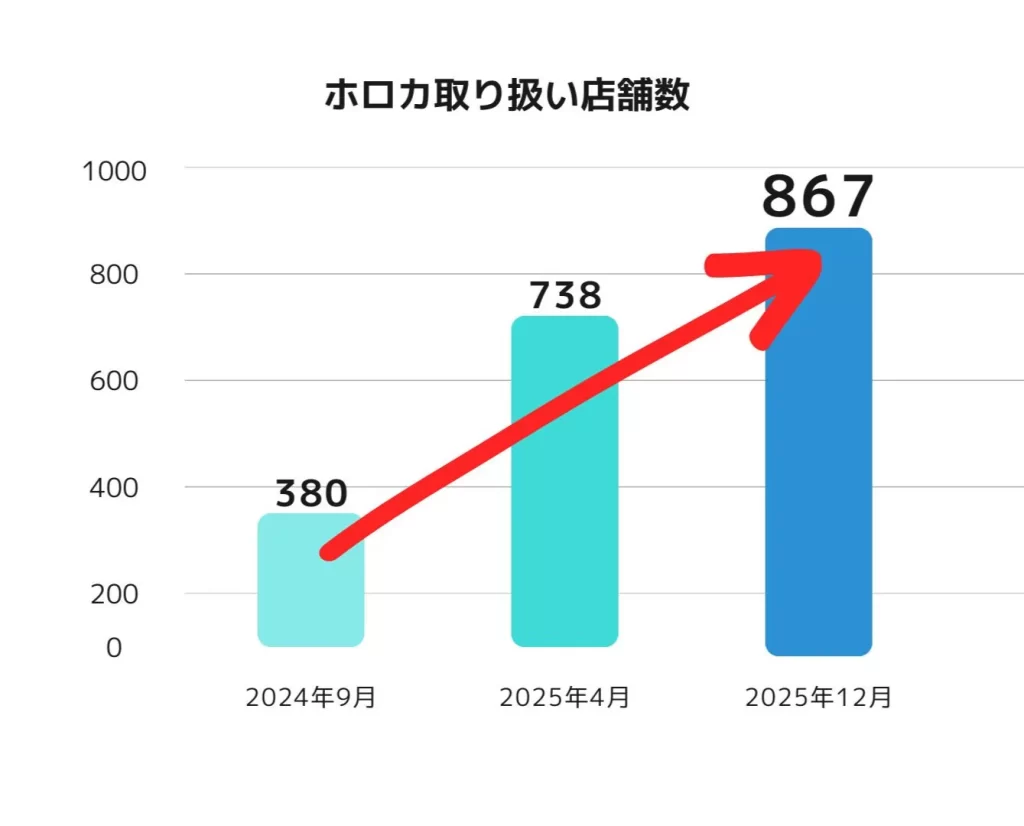 また、株式会社ブシロードの調査から、ホロカ取り扱い店舗数も右肩上がりで増えていることがわかります。発売直後の2024年9月は380店舗でしたが、2025年12月には867店舗にまで増加しました。交流会やショップ大会の開催数も年々増え、交流会の参加者数は1年半で2倍以上に増えています。